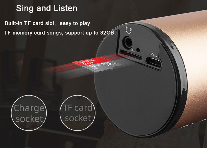 Support Bluetooth Connection, AUX Connection, and TF card Connection. You just need to connect your phone with cable or Bluetooth, and then open the singing APP on your phone. Built-in TF card slot, easy to play memory card songs. Clearly audio and vividly sound effect can make you listening and singing anytime and anywhere.The Bluetooth has a distance of connection(10m), Highly compatible 32GB TF card.
